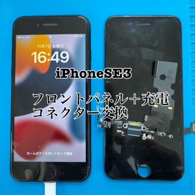 iPhoneSE3充電コネクター+フロントパネル交換40分。